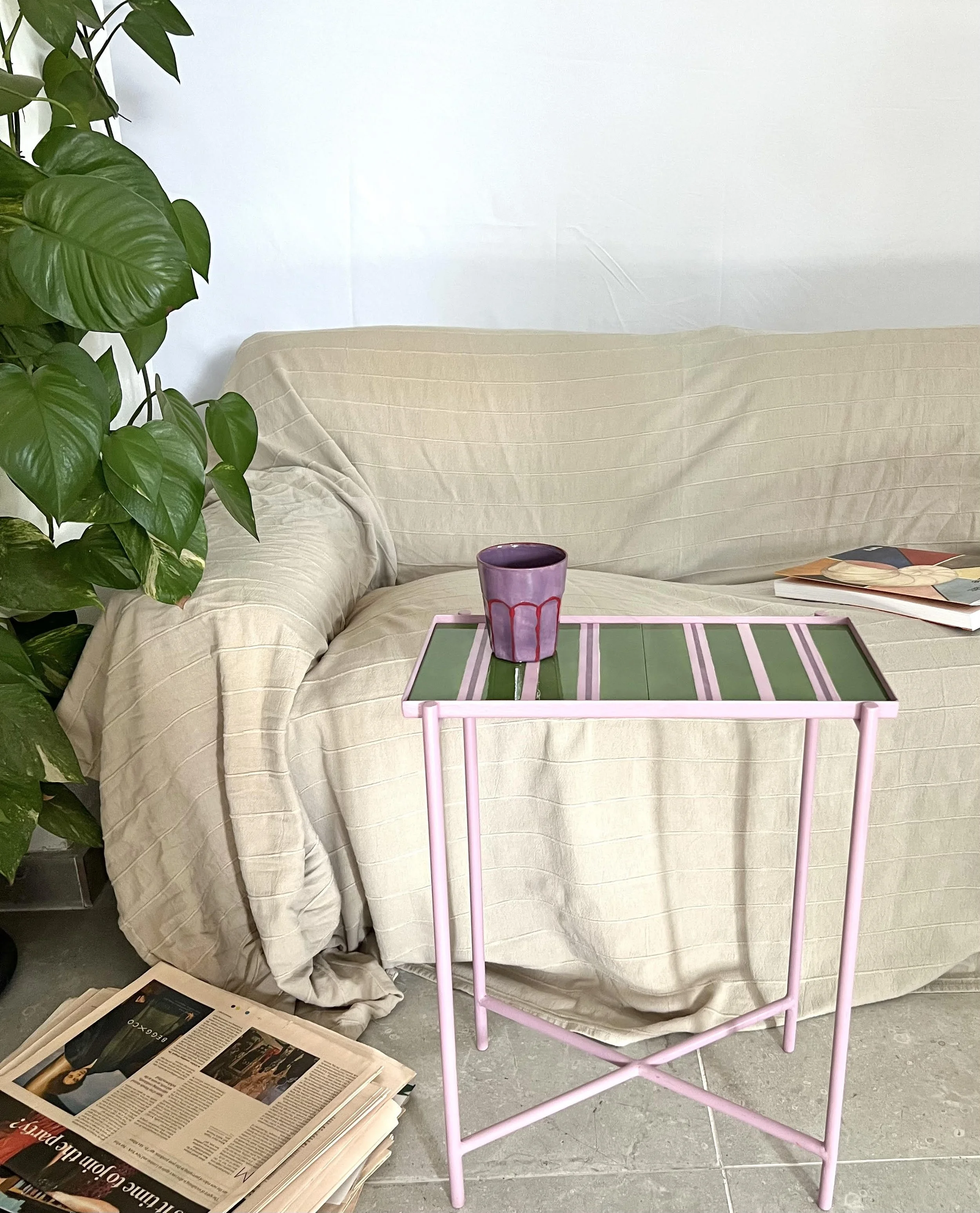 Side table with a metallic structure and square ceramic tile top.