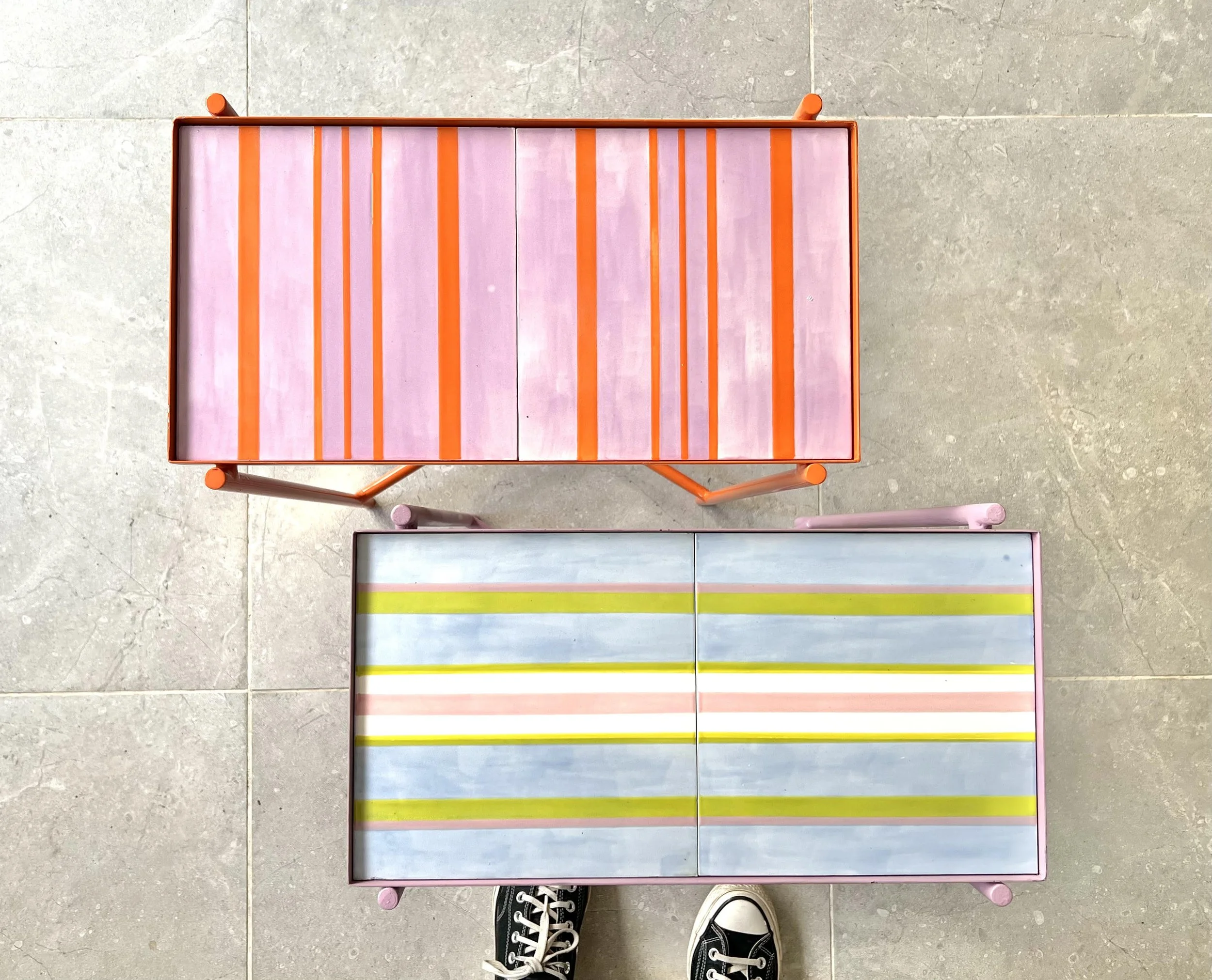 Tray tables can serve both as trays and coffee tables. They are designed for functionality, featuring colorful, unique tile tops. Each piece is hand-decorated for a distinctive touch.