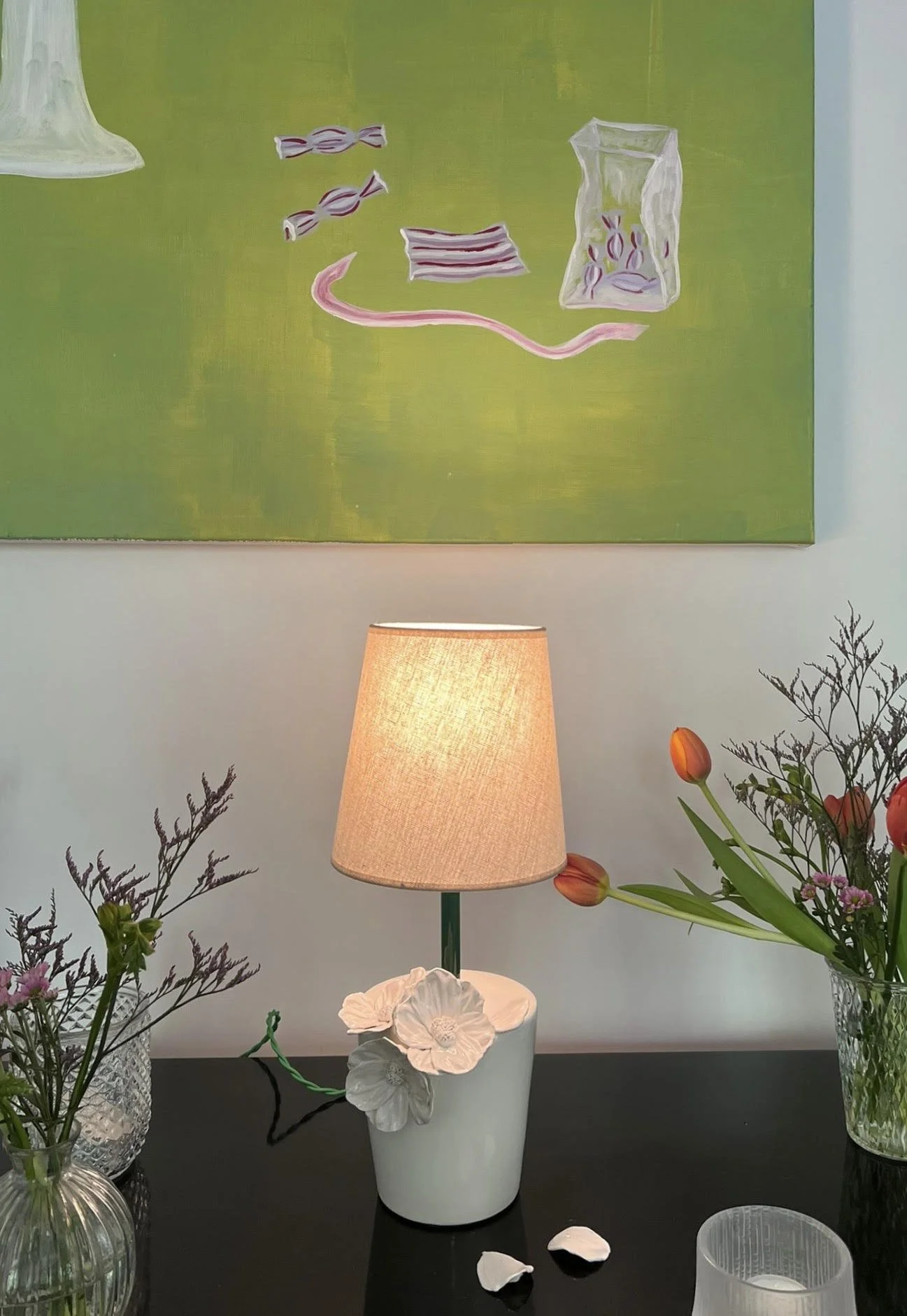 Mini sized table lamp with a bucket shaped ceramic base decorated with hand-built flowers and matching shade. Light bulb not included.